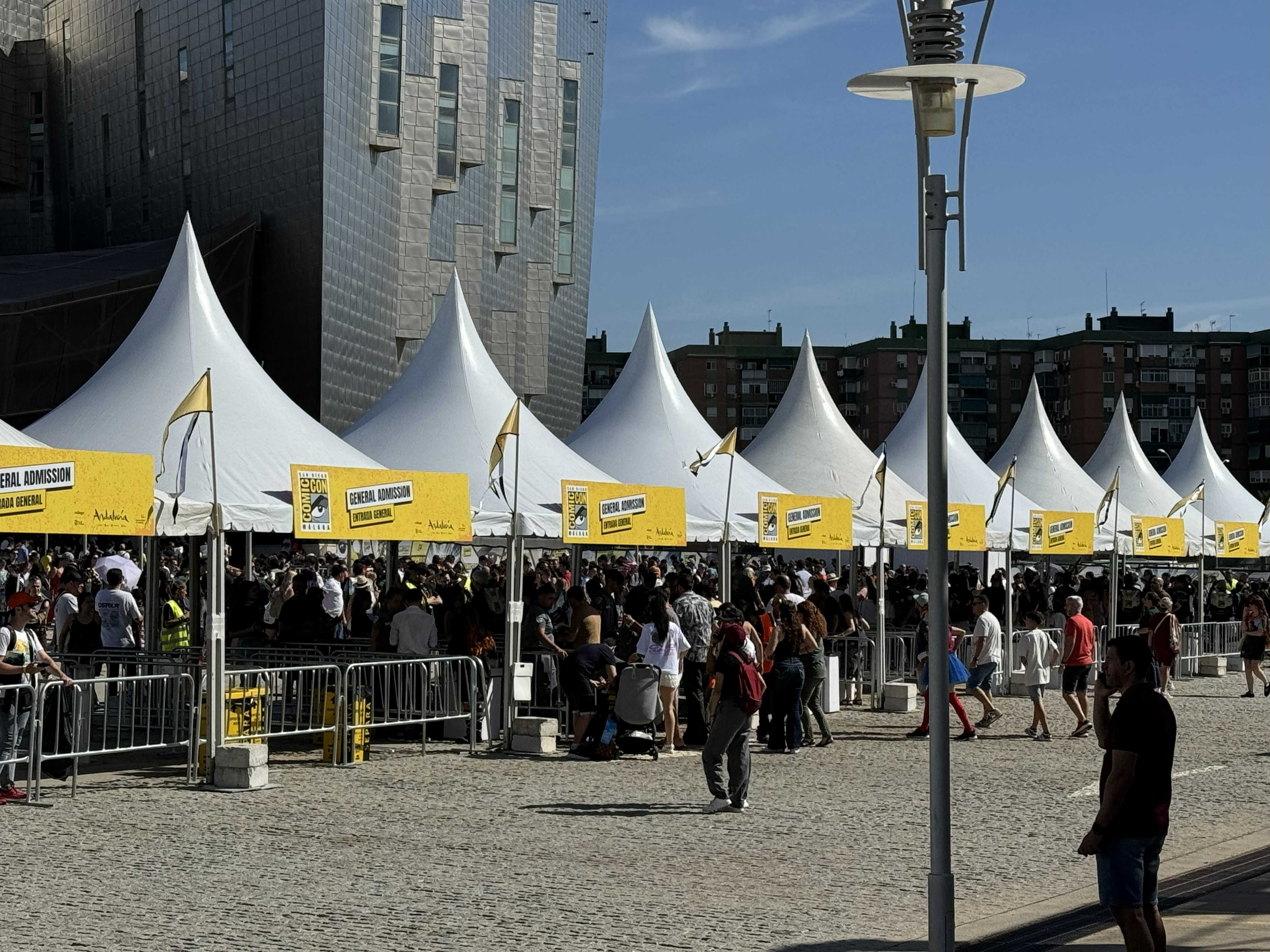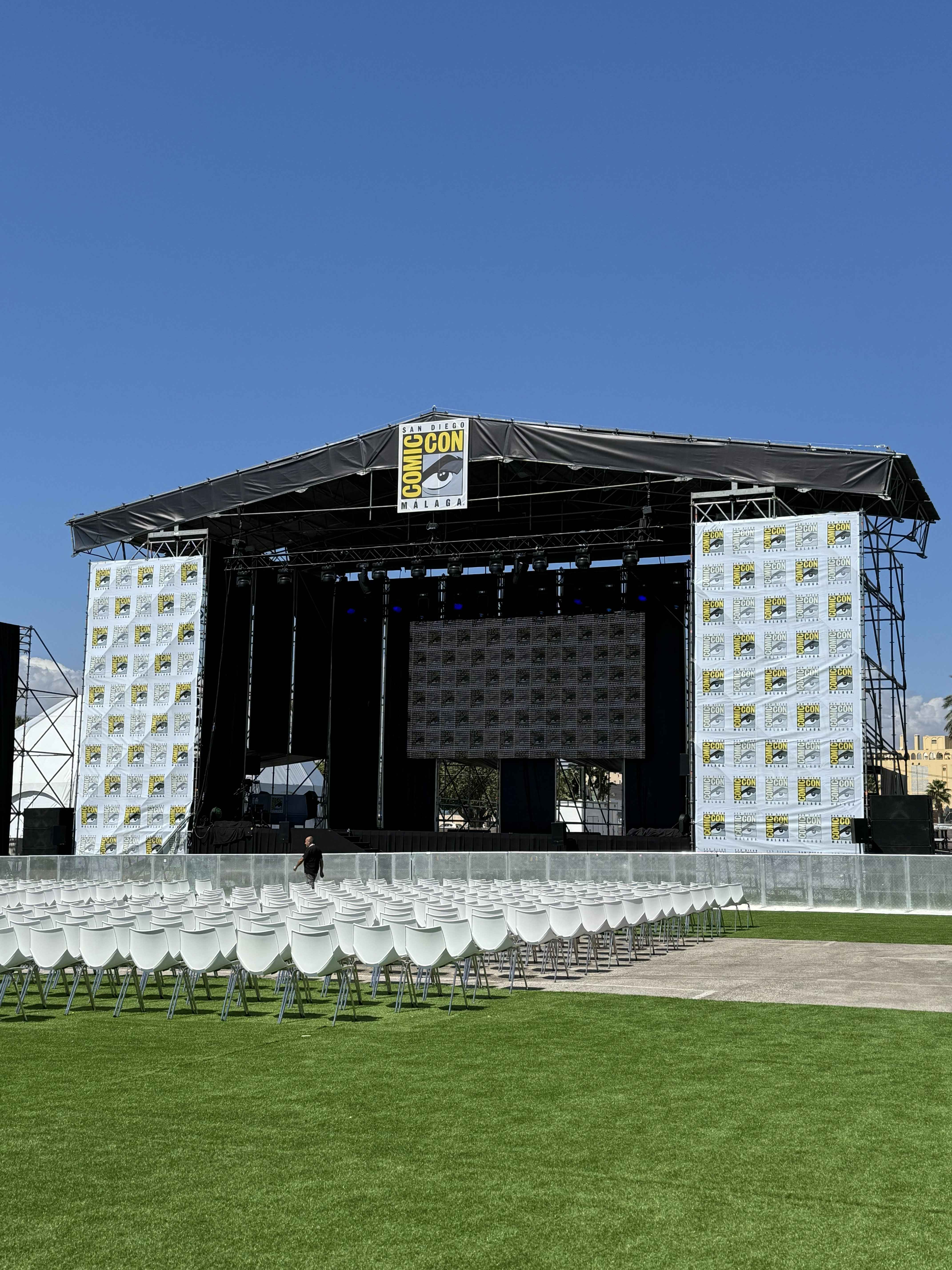 Y luego estaba el exterior. Al salir del pabellón, la primera impresión era de amplitud. Un mar de césped artificial se extendÃa ante nosotros... y ya. Era un espacio gigantesco, pero desaprovechado hasta niveles absurdos, donde dos lonas gigantes se convertÃan en el único y codiciado refugio contra el sol de justicia andaluz.