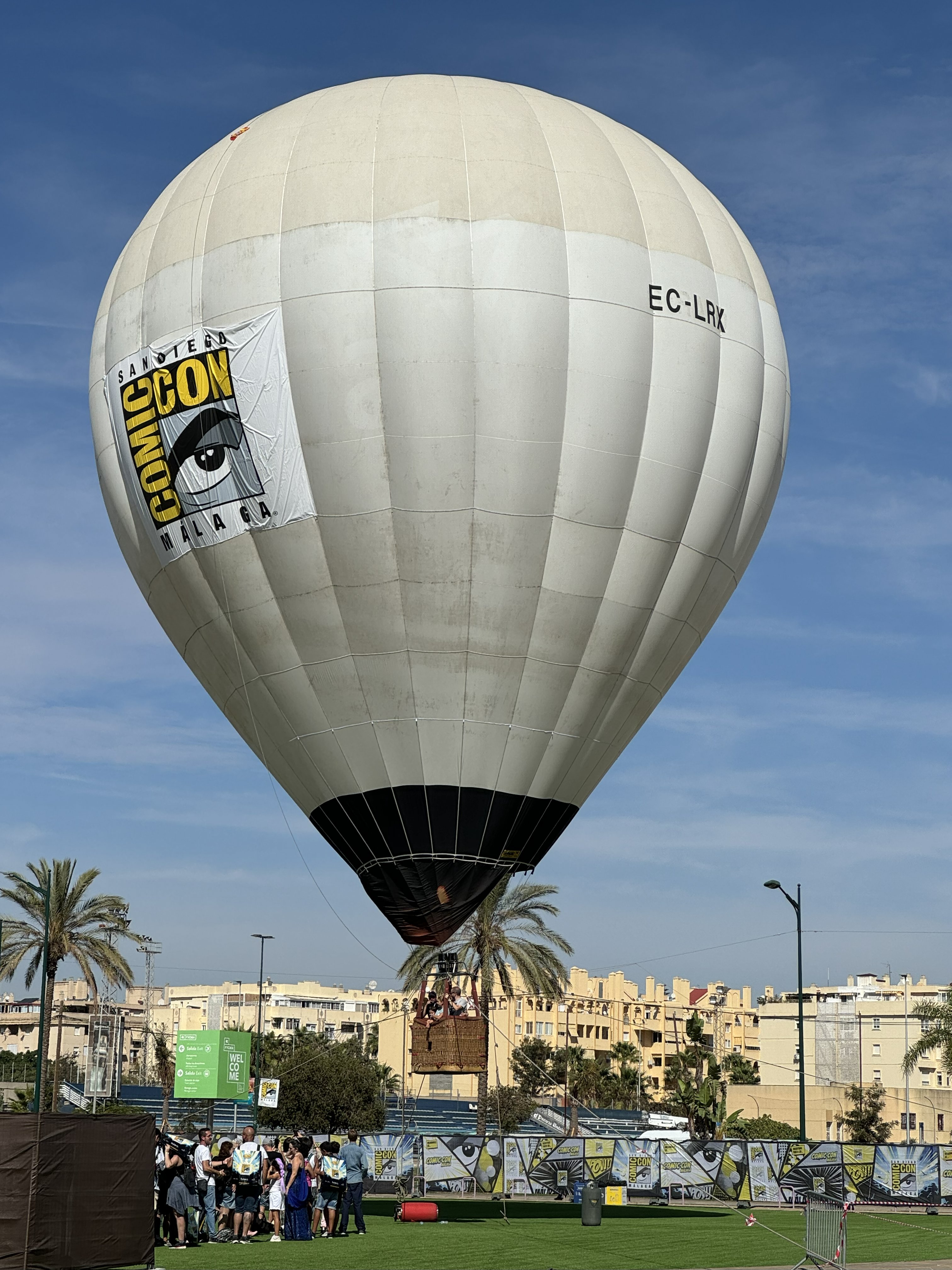 Al fondo, un escenario cumplÃa una función vital, casi de servicio público: retransmitir en directo los paneles del Hall M. Era el premio de consolación para los miles de personas que se quedaban fuera. Aparte de eso, la oferta era desoladora: unas pocas casetas de venta que parecÃan sacadas de un mercadillo navideño, la zona de comida con precios de atraco, un arco decorativo y un Goku gigante para la foto de rigor. ¿Actividades? Un simulador de paracaidismo (básicamente, una turbina que te hacÃa flotar), un simulador de montaña rusa de los amigos de Virtual Family y un globo aerostático que tenÃa más vocación de ancla que de nave, pasando más tiempo en tierra que en el aire por culpa del viento.